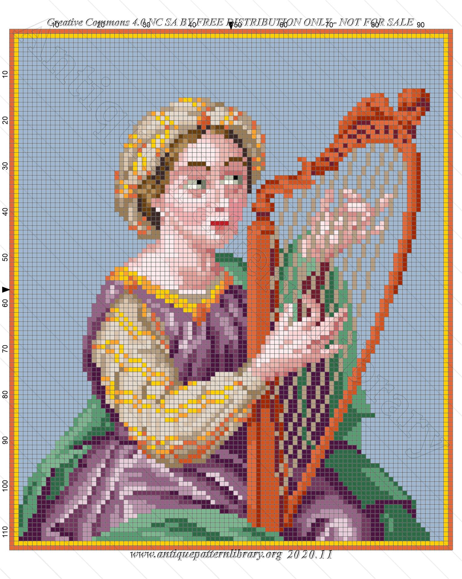 Handpainted Berlin woolwork pattern of St. Cecilia with her harp. Her feast day is 22th November.