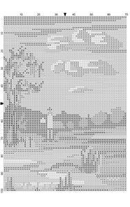 Painted Berlin woolwork pattern on cream cardboard, showing a church in a landscape. 70x100 stitches.
