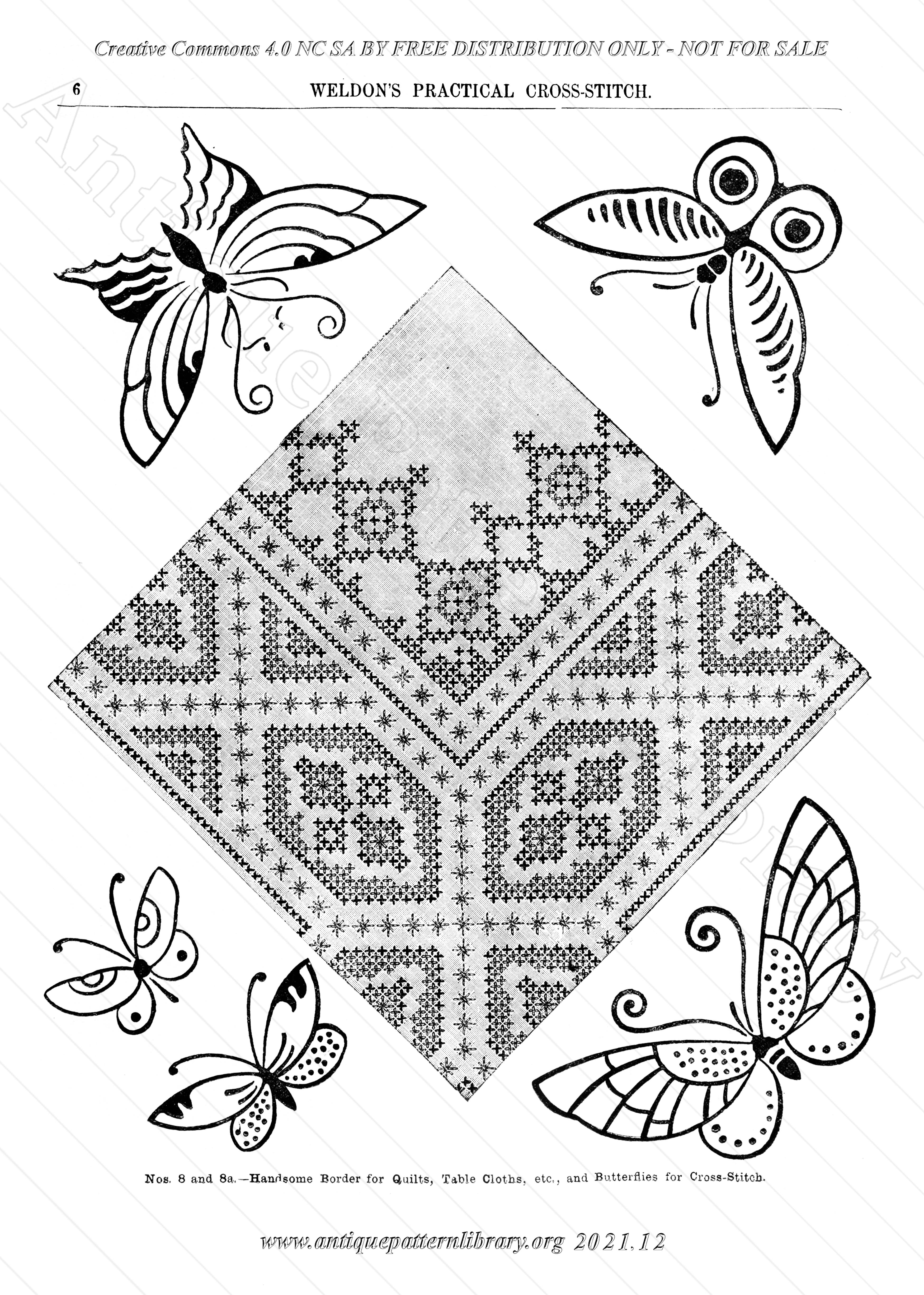16 pages, stapled. Monthly publication. This issue: Antimacassars, Book-covers, Butterflies, Borders for Various Purposes, Centres for Cross-stitch, Cushions, Floral Borders, Italian or Outline Stitch Designs, Insertions and Edgings, Initials for Marking Linen, Manner of Working Cross-stitch, Owl Border, Peacock Border, Quilt Designs, Star Patterns, Tea-Cloth Borders.