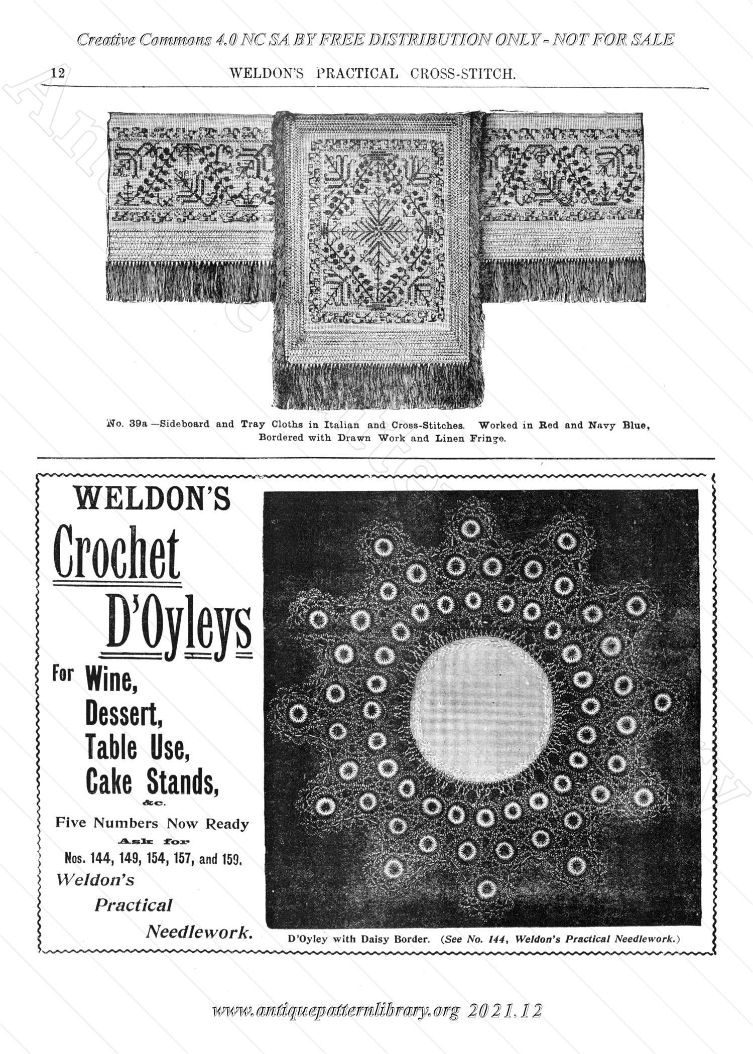 16 pages, stapled. Monthly publication. This issue: Antimacassars, Book-covers, Butterflies, Borders for Various Purposes, Centres for Cross-stitch, Cushions, Floral Borders, Italian or Outline Stitch Designs, Insertions and Edgings, Initials for Marking Linen, Manner of Working Cross-stitch, Owl Border, Peacock Border, Quilt Designs, Star Patterns, Tea-Cloth Borders.