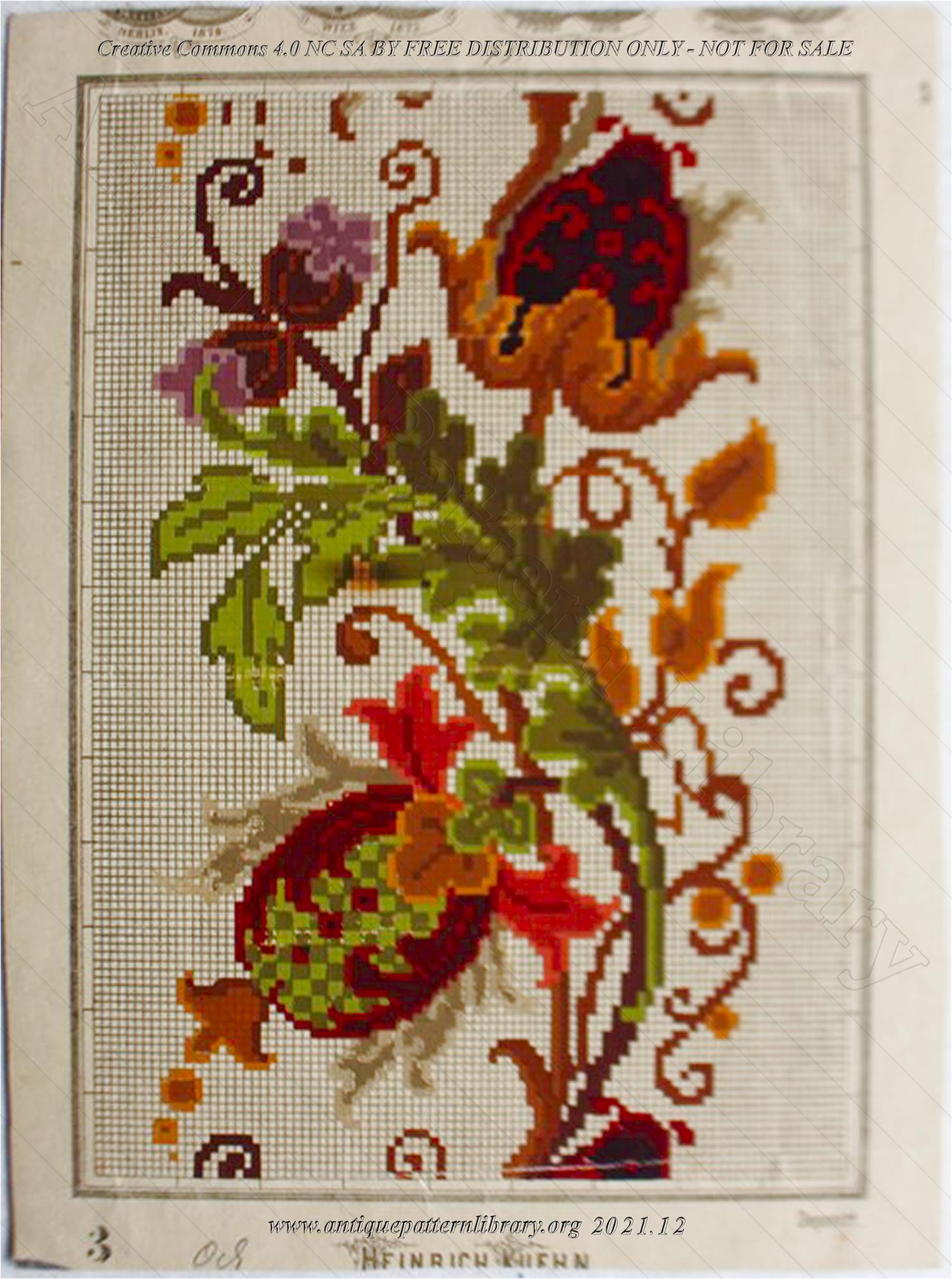 Single sheet, handpainted Berlin woolwork pattern on cream cardboard. The pattern number was cut off from the original. Floral edge design in brown, red and green colors. Charted design has been adapted to make top and bottom line up, supply missing elements and correct color inconsistencies.