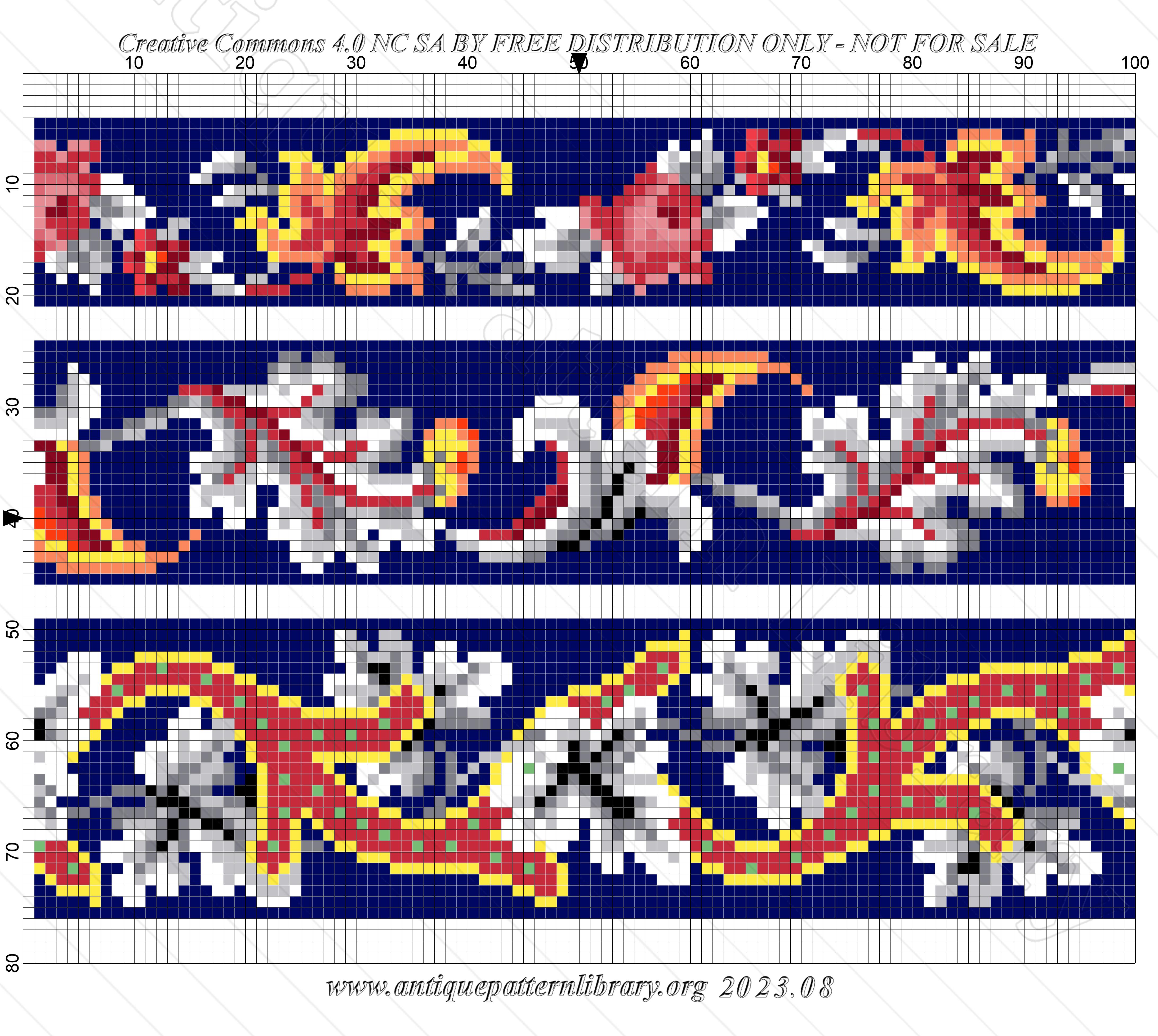 Handpainted Berlin woolwork pattern, with three border designs of varying width of 15-20-25 stitches, with a similar color palette. Floral designs.