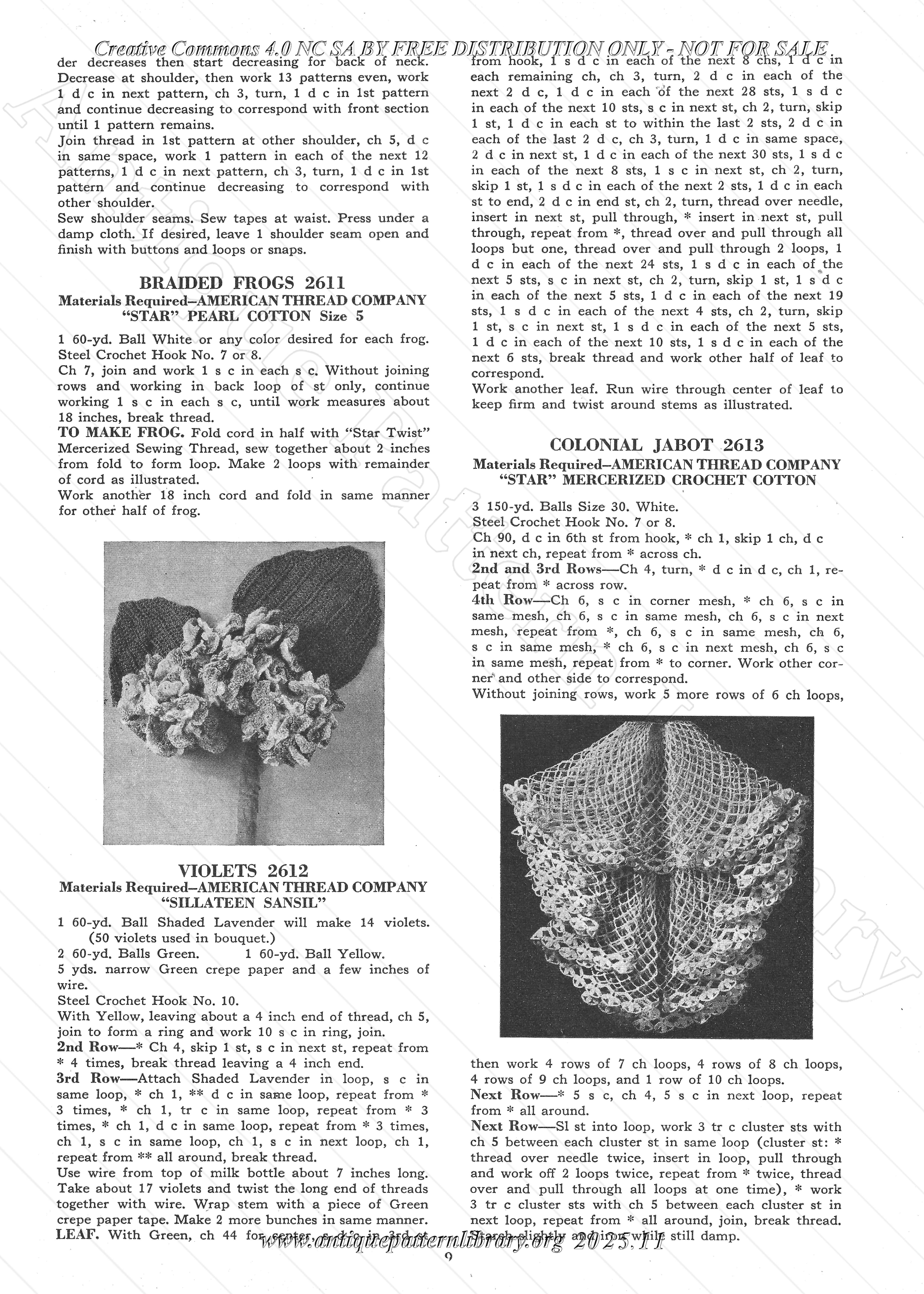 Crocheted trims for dresses, jackets, hats, and lingerie. Collars, jabots, blouse fronts (dickeys), braided frogs, many edgings. Tips on how to sew childrens dresses from old clothing and adapt clothes as the child grows. Includes patterns 2601 Doily Pockets, 2602 Tasseled Peplum, 2603 Button on Jabot, 2604 Fringed Epaulettes, 2605 Irish Crochet Collar and Cuffs, 2609 Cut-me-down Dickey, 2610 Butterfly Crocheted Dickey, 2611 Braided Frogs, 2612 Violets, 2613 Colonial Jabot, 2614 Basic Pillbox, 2615 Braid and Button, 2616 Fringed Tassel, 2617 Ruffled Edge, 2618 Crocheted Ball Fringe, 2619 Curly Braid, 2620 Doilies, 2621 Leaf and Braid, 2623 Basic Sailor, 2622 Lace Ruffle, 2624 Nightgown Frill, 2625 Slip Trim and Straps, 2626 Crocheted Camisole, 2627 Irish Crochet Edging, 2628 Pantie Lace, 2629 The Popular Fascinator, 2630 Bags, Gloves and Calot from Scraps, 2631 Jewelry , 2632 Belt with Pockets, 2633 Sunsuit from an old Apron, 2634 Dress, 2635 Pinafore, 2636 Slip Edging, 2606 and 2608 Braid Trim, 2607 Pussy Cat Bow.
