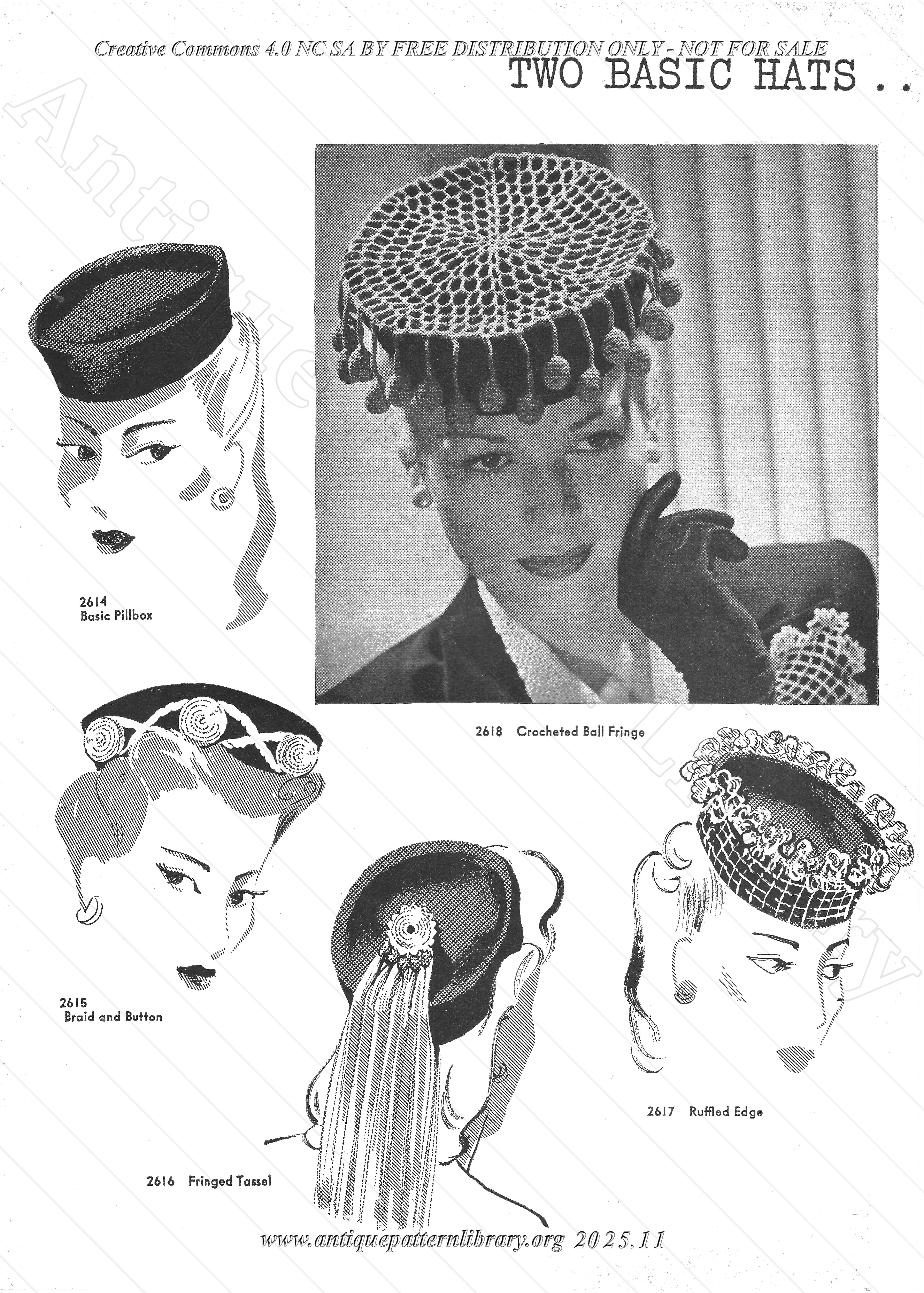 Crocheted trims for dresses, jackets, hats, and lingerie. Collars, jabots, blouse fronts (dickeys), braided frogs, many edgings. Tips on how to sew childrens dresses from old clothing and adapt clothes as the child grows. Includes patterns 2601 Doily Pockets, 2602 Tasseled Peplum, 2603 Button on Jabot, 2604 Fringed Epaulettes, 2605 Irish Crochet Collar and Cuffs, 2609 Cut-me-down Dickey, 2610 Butterfly Crocheted Dickey, 2611 Braided Frogs, 2612 Violets, 2613 Colonial Jabot, 2614 Basic Pillbox, 2615 Braid and Button, 2616 Fringed Tassel, 2617 Ruffled Edge, 2618 Crocheted Ball Fringe, 2619 Curly Braid, 2620 Doilies, 2621 Leaf and Braid, 2623 Basic Sailor, 2622 Lace Ruffle, 2624 Nightgown Frill, 2625 Slip Trim and Straps, 2626 Crocheted Camisole, 2627 Irish Crochet Edging, 2628 Pantie Lace, 2629 The Popular Fascinator, 2630 Bags, Gloves and Calot from Scraps, 2631 Jewelry , 2632 Belt with Pockets, 2633 Sunsuit from an old Apron, 2634 Dress, 2635 Pinafore, 2636 Slip Edging, 2606 and 2608 Braid Trim, 2607 Pussy Cat Bow.