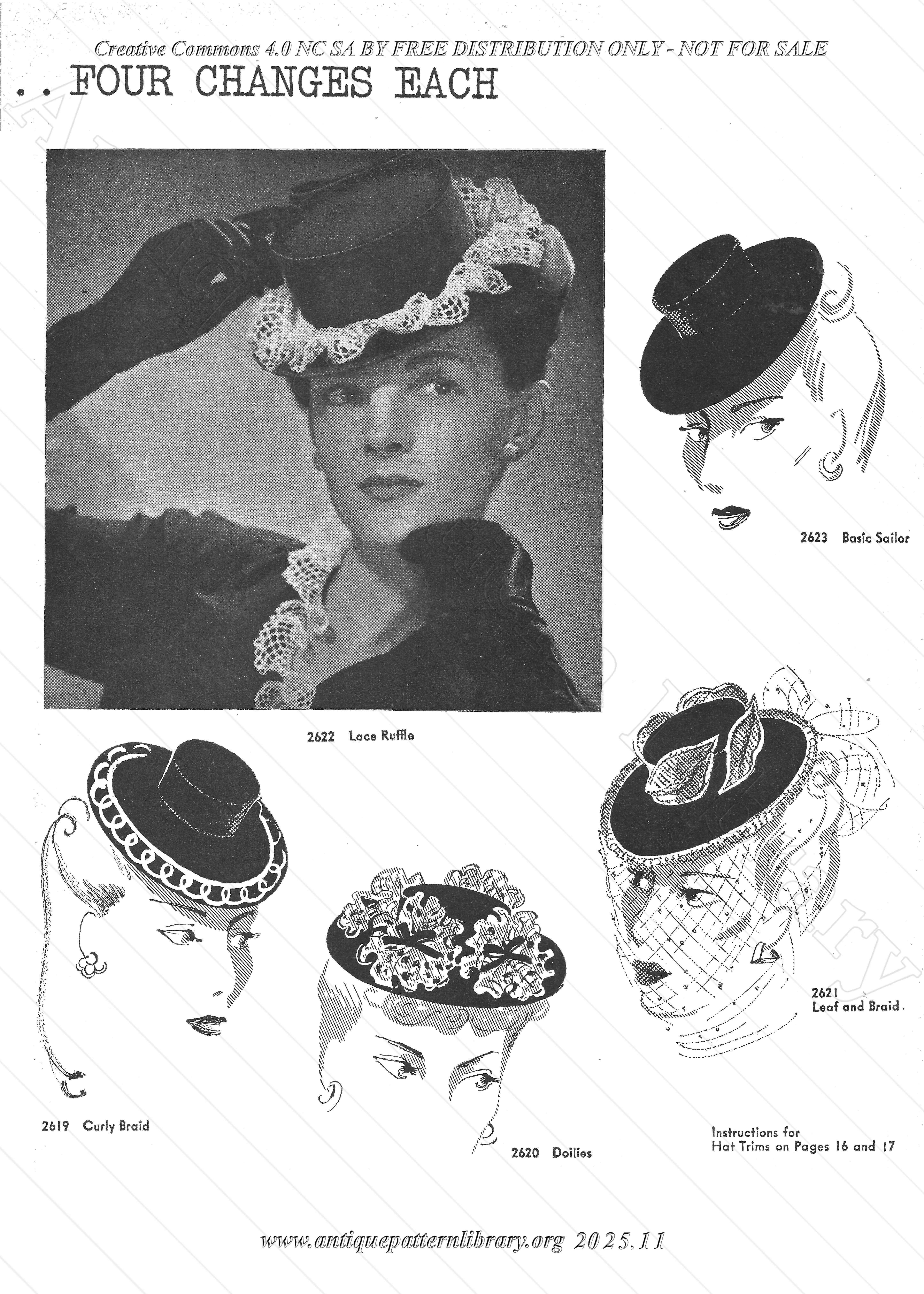 Crocheted trims for dresses, jackets, hats, and lingerie. Collars, jabots, blouse fronts (dickeys), braided frogs, many edgings. Tips on how to sew childrens dresses from old clothing and adapt clothes as the child grows. Includes patterns 2601 Doily Pockets, 2602 Tasseled Peplum, 2603 Button on Jabot, 2604 Fringed Epaulettes, 2605 Irish Crochet Collar and Cuffs, 2609 Cut-me-down Dickey, 2610 Butterfly Crocheted Dickey, 2611 Braided Frogs, 2612 Violets, 2613 Colonial Jabot, 2614 Basic Pillbox, 2615 Braid and Button, 2616 Fringed Tassel, 2617 Ruffled Edge, 2618 Crocheted Ball Fringe, 2619 Curly Braid, 2620 Doilies, 2621 Leaf and Braid, 2623 Basic Sailor, 2622 Lace Ruffle, 2624 Nightgown Frill, 2625 Slip Trim and Straps, 2626 Crocheted Camisole, 2627 Irish Crochet Edging, 2628 Pantie Lace, 2629 The Popular Fascinator, 2630 Bags, Gloves and Calot from Scraps, 2631 Jewelry , 2632 Belt with Pockets, 2633 Sunsuit from an old Apron, 2634 Dress, 2635 Pinafore, 2636 Slip Edging, 2606 and 2608 Braid Trim, 2607 Pussy Cat Bow.