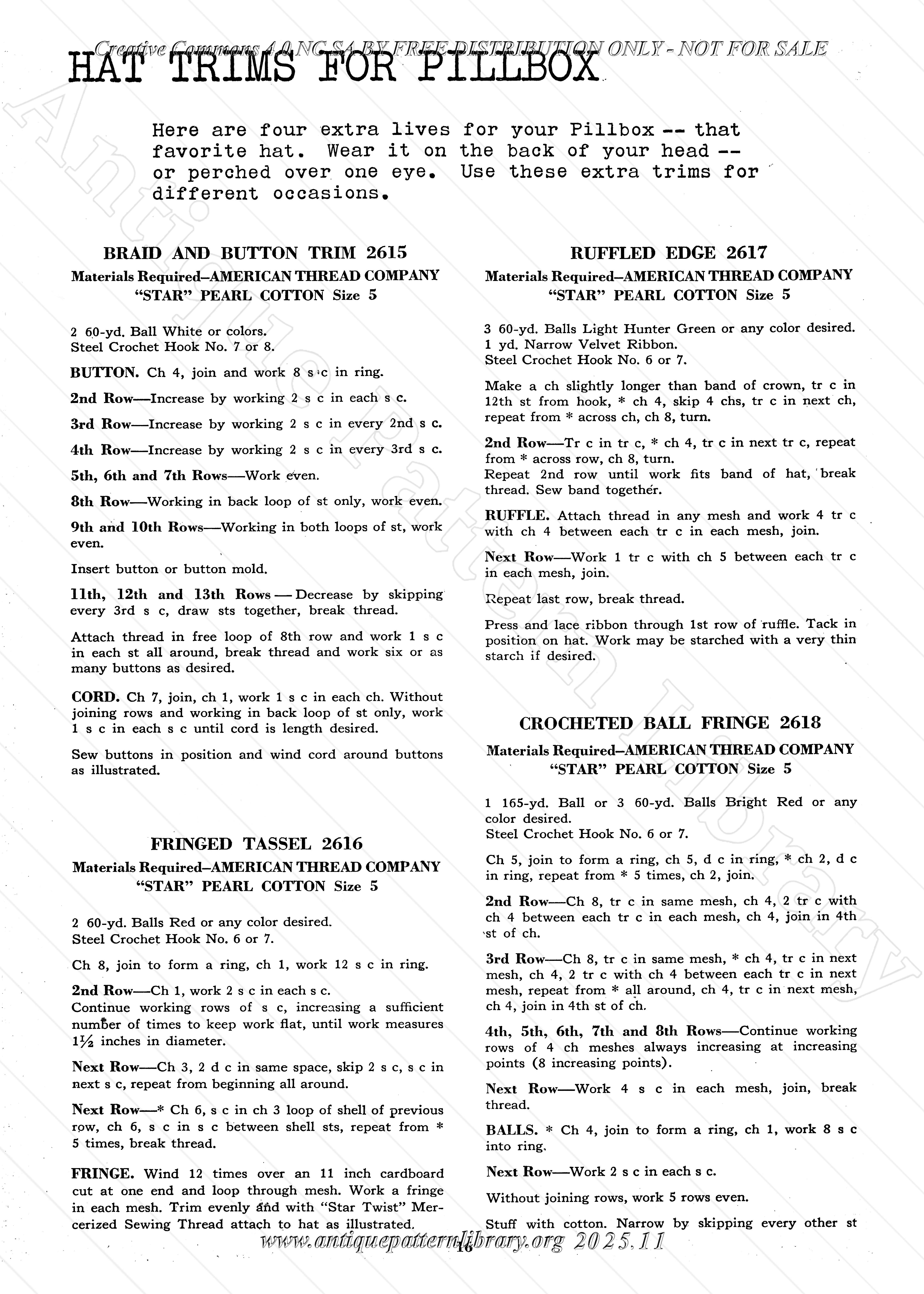 Crocheted trims for dresses, jackets, hats, and lingerie. Collars, jabots, blouse fronts (dickeys), braided frogs, many edgings. Tips on how to sew childrens dresses from old clothing and adapt clothes as the child grows. Includes patterns 2601 Doily Pockets, 2602 Tasseled Peplum, 2603 Button on Jabot, 2604 Fringed Epaulettes, 2605 Irish Crochet Collar and Cuffs, 2609 Cut-me-down Dickey, 2610 Butterfly Crocheted Dickey, 2611 Braided Frogs, 2612 Violets, 2613 Colonial Jabot, 2614 Basic Pillbox, 2615 Braid and Button, 2616 Fringed Tassel, 2617 Ruffled Edge, 2618 Crocheted Ball Fringe, 2619 Curly Braid, 2620 Doilies, 2621 Leaf and Braid, 2623 Basic Sailor, 2622 Lace Ruffle, 2624 Nightgown Frill, 2625 Slip Trim and Straps, 2626 Crocheted Camisole, 2627 Irish Crochet Edging, 2628 Pantie Lace, 2629 The Popular Fascinator, 2630 Bags, Gloves and Calot from Scraps, 2631 Jewelry , 2632 Belt with Pockets, 2633 Sunsuit from an old Apron, 2634 Dress, 2635 Pinafore, 2636 Slip Edging, 2606 and 2608 Braid Trim, 2607 Pussy Cat Bow.