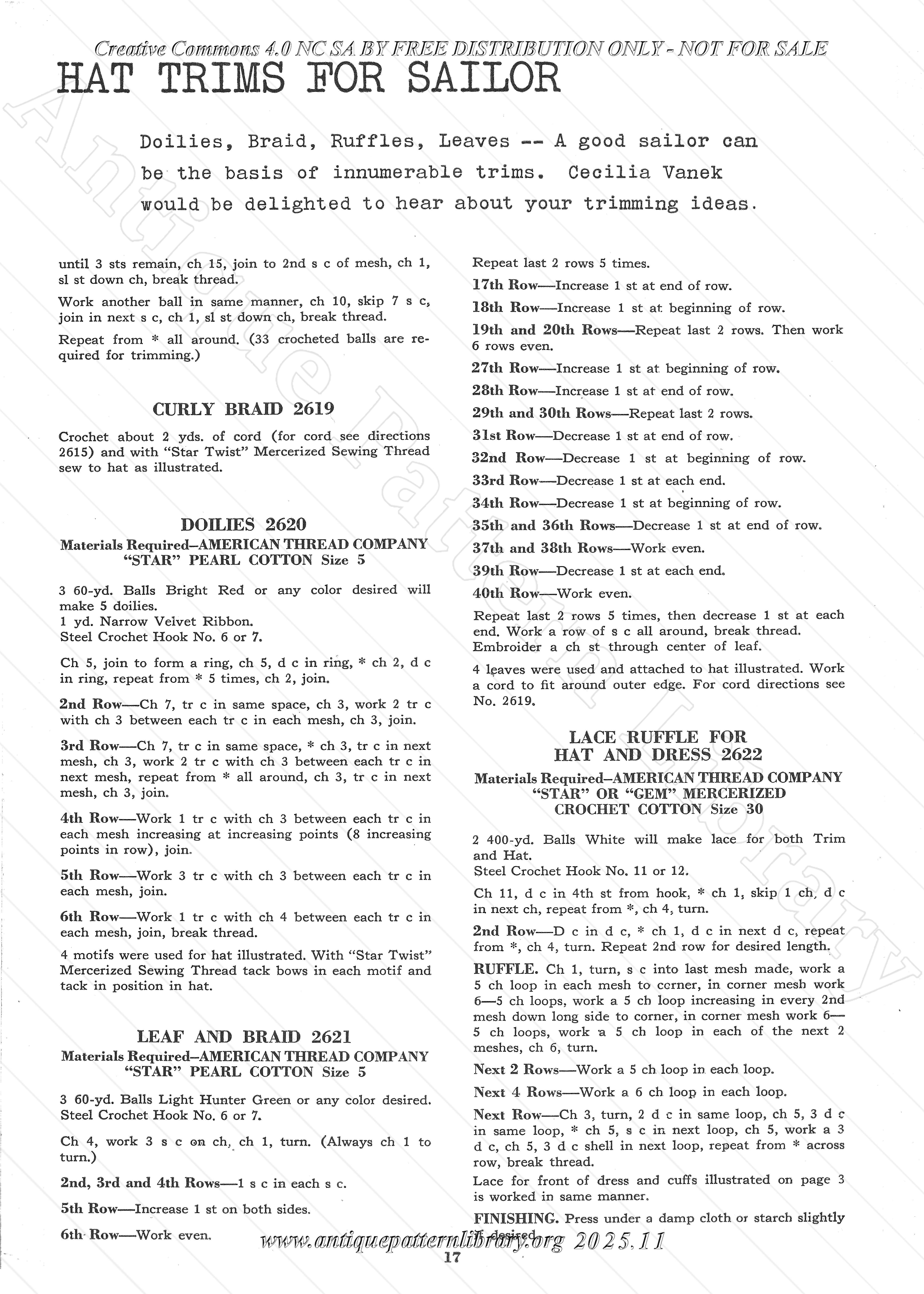 Crocheted trims for dresses, jackets, hats, and lingerie. Collars, jabots, blouse fronts (dickeys), braided frogs, many edgings. Tips on how to sew childrens dresses from old clothing and adapt clothes as the child grows. Includes patterns 2601 Doily Pockets, 2602 Tasseled Peplum, 2603 Button on Jabot, 2604 Fringed Epaulettes, 2605 Irish Crochet Collar and Cuffs, 2609 Cut-me-down Dickey, 2610 Butterfly Crocheted Dickey, 2611 Braided Frogs, 2612 Violets, 2613 Colonial Jabot, 2614 Basic Pillbox, 2615 Braid and Button, 2616 Fringed Tassel, 2617 Ruffled Edge, 2618 Crocheted Ball Fringe, 2619 Curly Braid, 2620 Doilies, 2621 Leaf and Braid, 2623 Basic Sailor, 2622 Lace Ruffle, 2624 Nightgown Frill, 2625 Slip Trim and Straps, 2626 Crocheted Camisole, 2627 Irish Crochet Edging, 2628 Pantie Lace, 2629 The Popular Fascinator, 2630 Bags, Gloves and Calot from Scraps, 2631 Jewelry , 2632 Belt with Pockets, 2633 Sunsuit from an old Apron, 2634 Dress, 2635 Pinafore, 2636 Slip Edging, 2606 and 2608 Braid Trim, 2607 Pussy Cat Bow.