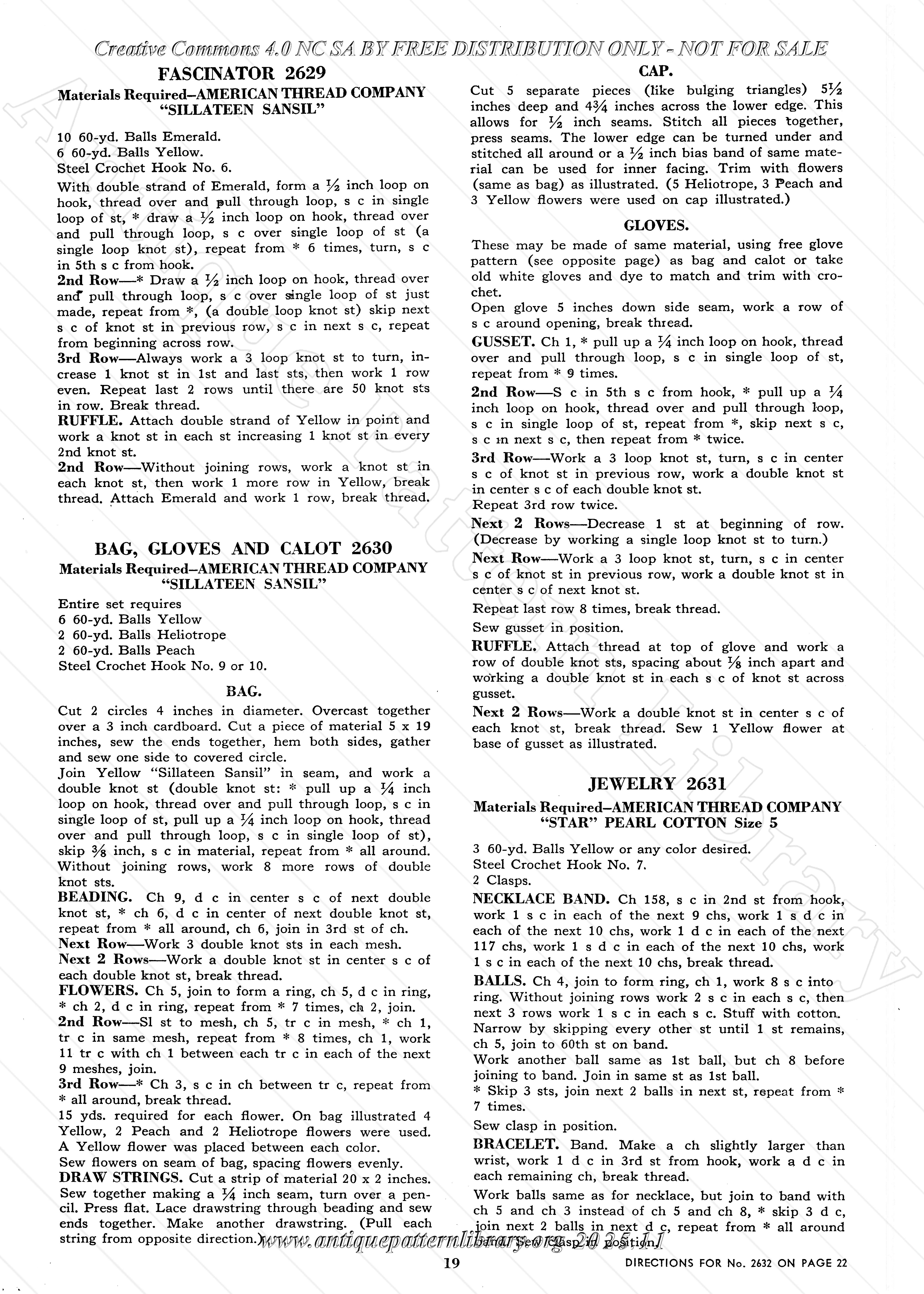 Crocheted trims for dresses, jackets, hats, and lingerie. Collars, jabots, blouse fronts (dickeys), braided frogs, many edgings. Tips on how to sew childrens dresses from old clothing and adapt clothes as the child grows. Includes patterns 2601 Doily Pockets, 2602 Tasseled Peplum, 2603 Button on Jabot, 2604 Fringed Epaulettes, 2605 Irish Crochet Collar and Cuffs, 2609 Cut-me-down Dickey, 2610 Butterfly Crocheted Dickey, 2611 Braided Frogs, 2612 Violets, 2613 Colonial Jabot, 2614 Basic Pillbox, 2615 Braid and Button, 2616 Fringed Tassel, 2617 Ruffled Edge, 2618 Crocheted Ball Fringe, 2619 Curly Braid, 2620 Doilies, 2621 Leaf and Braid, 2623 Basic Sailor, 2622 Lace Ruffle, 2624 Nightgown Frill, 2625 Slip Trim and Straps, 2626 Crocheted Camisole, 2627 Irish Crochet Edging, 2628 Pantie Lace, 2629 The Popular Fascinator, 2630 Bags, Gloves and Calot from Scraps, 2631 Jewelry , 2632 Belt with Pockets, 2633 Sunsuit from an old Apron, 2634 Dress, 2635 Pinafore, 2636 Slip Edging, 2606 and 2608 Braid Trim, 2607 Pussy Cat Bow.