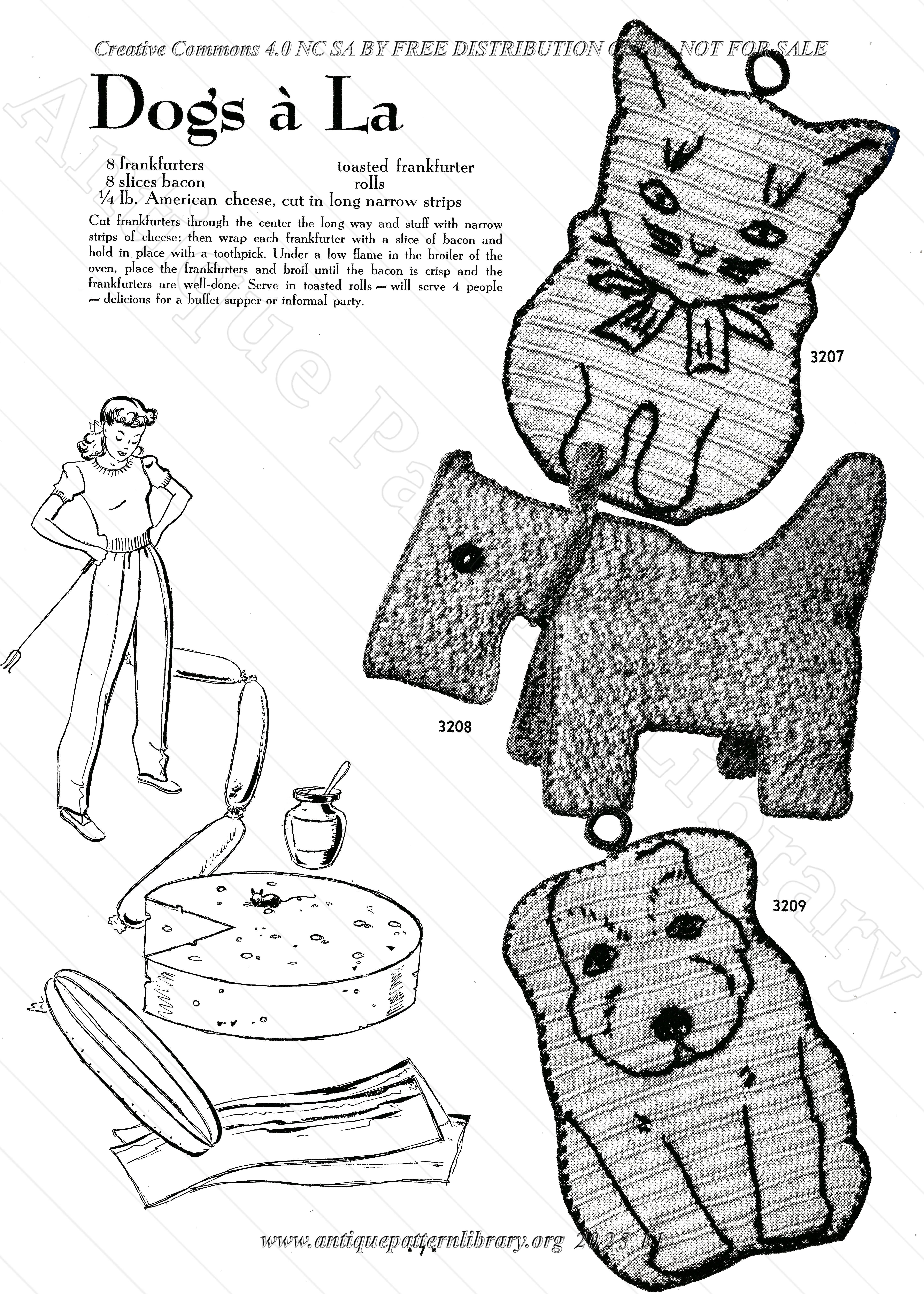 Half of the pages show pot holder illustrations and recipes , the other half has the patterns for the crocheted potholders. Square potholders, round, in the shape of dogs, cats, pot and kettle, floral, mitten and shoe, fan, root and maize. Some pot holders are appliqued or embroiderd afterwards. The recipes are for Scotch Scones, Oyster Bisque, Dogs à La, Barbecued Spare Ribs, Parsley Puffs, Eggs Foo Young, Watercress Stuffing, Russian Pilaf, Curry of Shrimp, Green Tomato Pickles, Iced Fruit Soup, Chicken Gumbo.