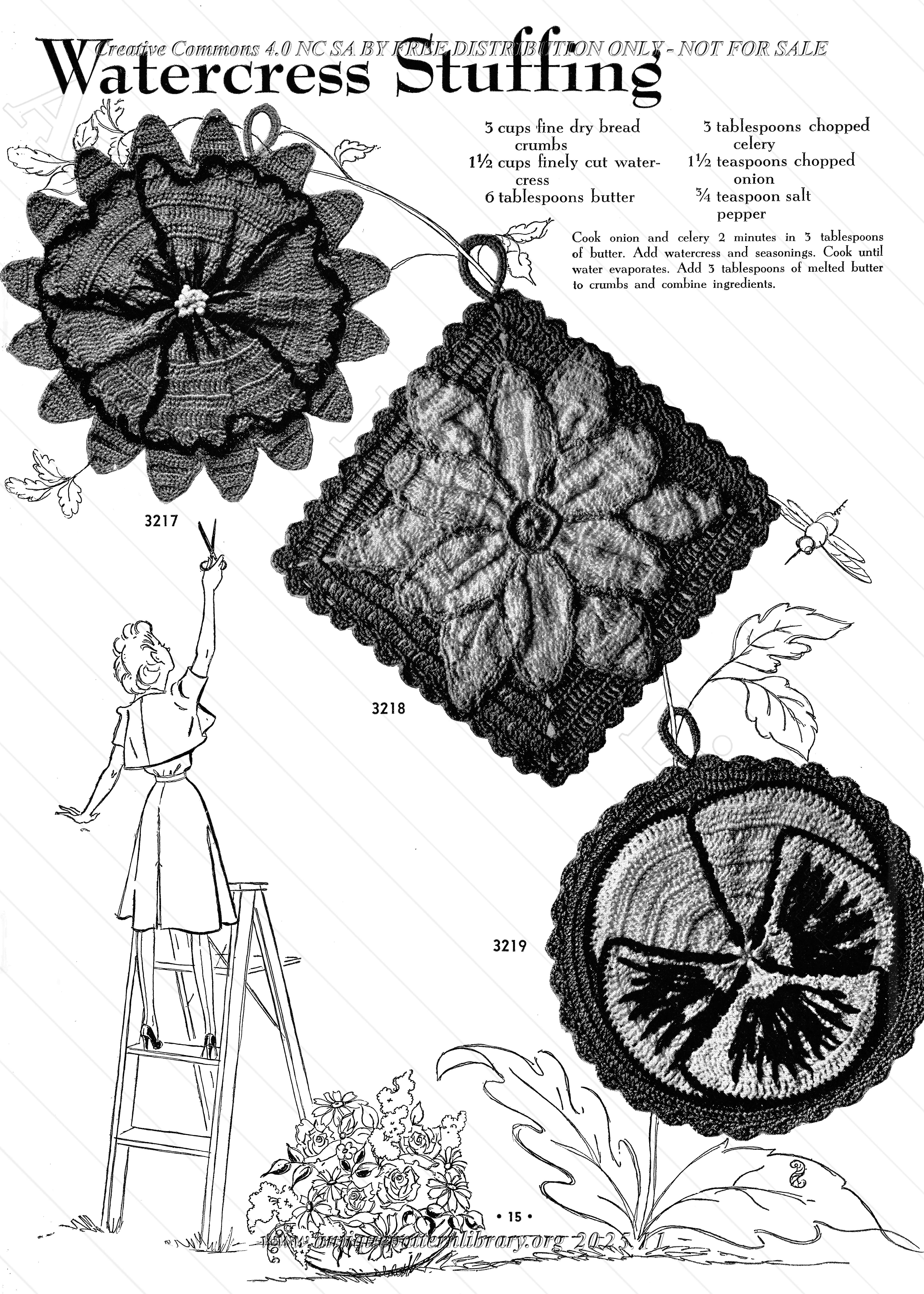 Half of the pages show pot holder illustrations and recipes , the other half has the patterns for the crocheted potholders. Square potholders, round, in the shape of dogs, cats, pot and kettle, floral, mitten and shoe, fan, root and maize. Some pot holders are appliqued or embroiderd afterwards. The recipes are for Scotch Scones, Oyster Bisque, Dogs à La, Barbecued Spare Ribs, Parsley Puffs, Eggs Foo Young, Watercress Stuffing, Russian Pilaf, Curry of Shrimp, Green Tomato Pickles, Iced Fruit Soup, Chicken Gumbo.