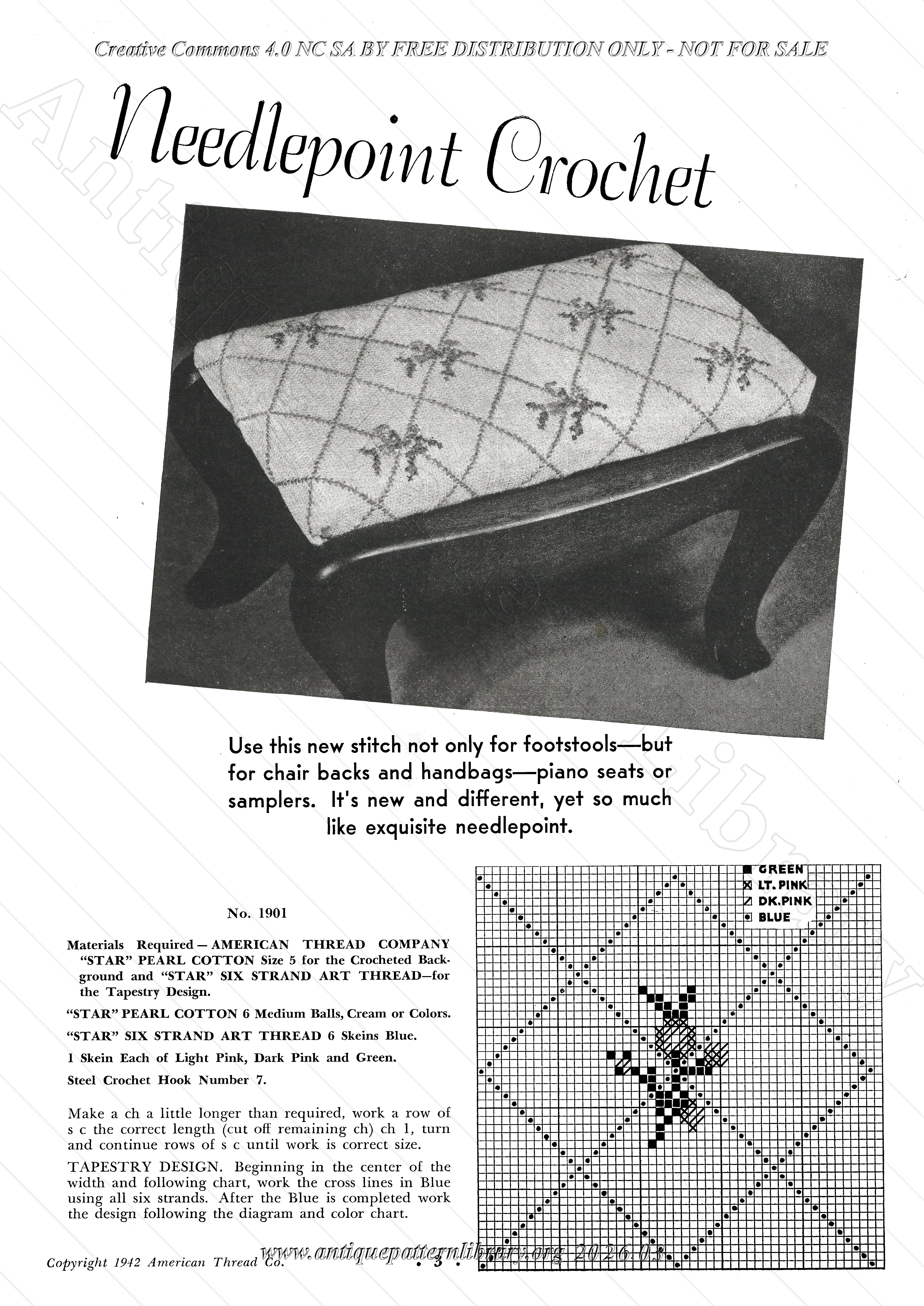 Needlepoint crochet for a footstool no. 1901, crocheted (no. 1902 and 1903) and knitted (no. 1904) chairbacks, complete with armrest covers, daisy motif no. 1905, crocheted doily no. 1906, tatted doily no. 1907, crocheted doily in 2 colors no. 1908, crocheted motif for table scarf of cluny design no. 1909, tatted motif for same no. 1910, porch set (placemats) no. 1911, lacy table cloth no. 1912, daisy lunch cloth no. 1913, filet and popcorn bedspread no. 1914, bridge set no. 1915, luncheon set (placemats, napkins and centerpiece) no. 1916, crocheted cross-stitch rug no. 1917, crocheted rug with tufted edge no. 1918, huck towel edge no. 1919-A, crochet-trimmed Turkish Towel no. 1920-A, crocheted flower basket no. 1921, hot plate mats no. 1922 and 1923,