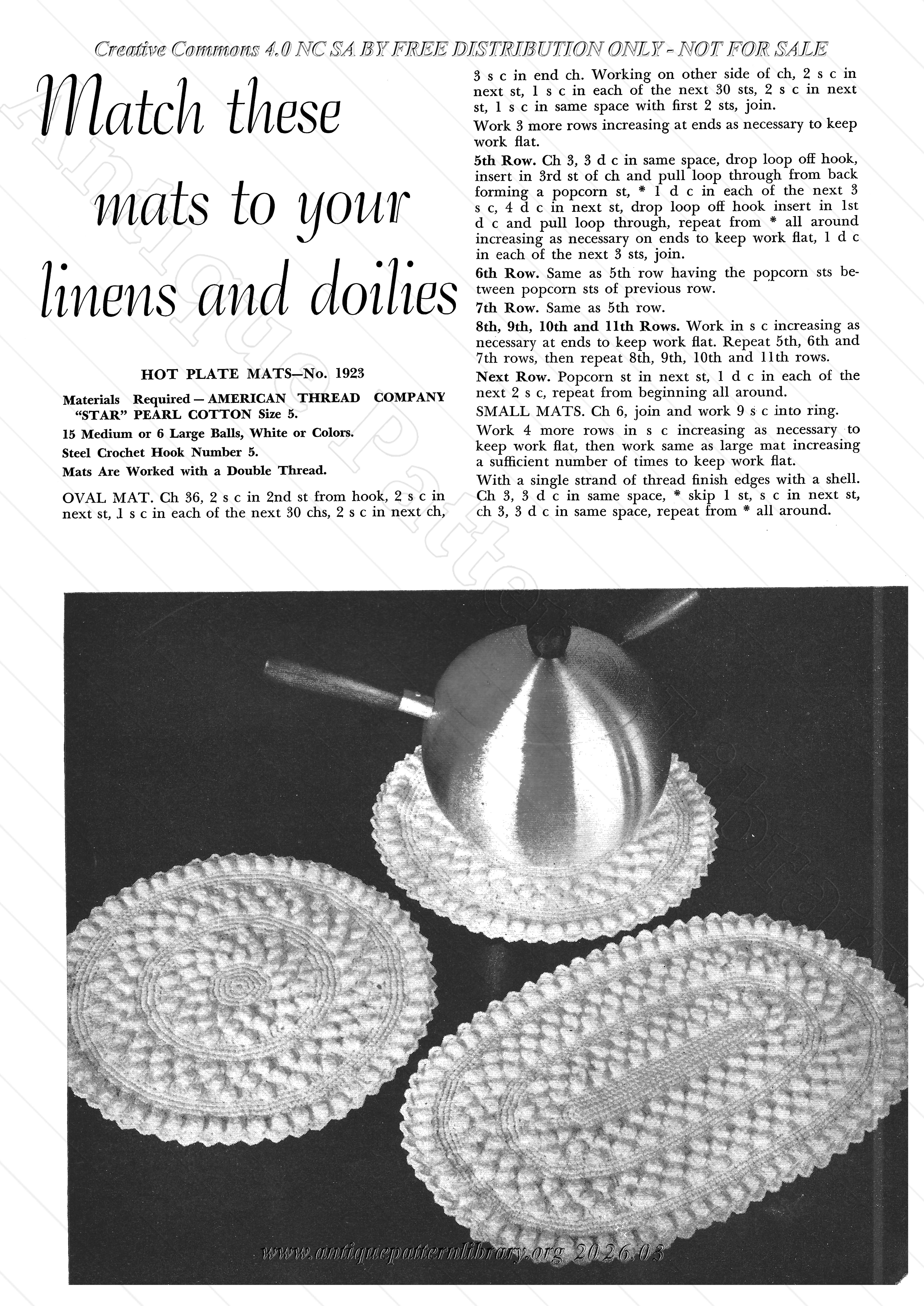 Needlepoint crochet for a footstool no. 1901, crocheted (no. 1902 and 1903) and knitted (no. 1904) chairbacks, complete with armrest covers, daisy motif no. 1905, crocheted doily no. 1906, tatted doily no. 1907, crocheted doily in 2 colors no. 1908, crocheted motif for table scarf of cluny design no. 1909, tatted motif for same no. 1910, porch set (placemats) no. 1911, lacy table cloth no. 1912, daisy lunch cloth no. 1913, filet and popcorn bedspread no. 1914, bridge set no. 1915, luncheon set (placemats, napkins and centerpiece) no. 1916, crocheted cross-stitch rug no. 1917, crocheted rug with tufted edge no. 1918, huck towel edge no. 1919-A, crochet-trimmed Turkish Towel no. 1920-A, crocheted flower basket no. 1921, hot plate mats no. 1922 and 1923,