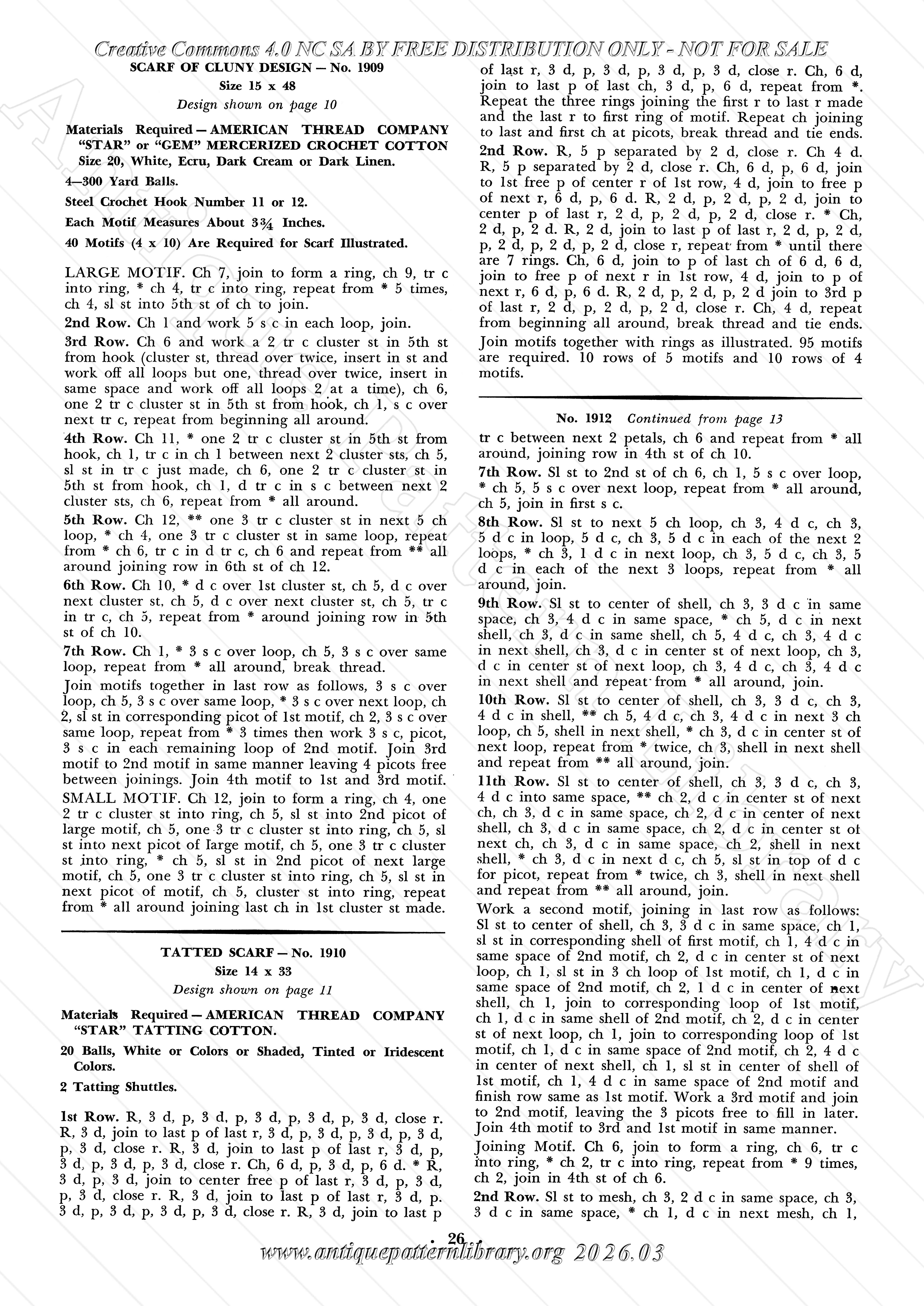 Needlepoint crochet for a footstool no. 1901, crocheted (no. 1902 and 1903) and knitted (no. 1904) chairbacks, complete with armrest covers, daisy motif no. 1905, crocheted doily no. 1906, tatted doily no. 1907, crocheted doily in 2 colors no. 1908, crocheted motif for table scarf of cluny design no. 1909, tatted motif for same no. 1910, porch set (placemats) no. 1911, lacy table cloth no. 1912, daisy lunch cloth no. 1913, filet and popcorn bedspread no. 1914, bridge set no. 1915, luncheon set (placemats, napkins and centerpiece) no. 1916, crocheted cross-stitch rug no. 1917, crocheted rug with tufted edge no. 1918, huck towel edge no. 1919-A, crochet-trimmed Turkish Towel no. 1920-A, crocheted flower basket no. 1921, hot plate mats no. 1922 and 1923,