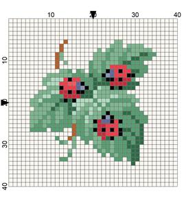 Small fragment of a handpainted Berlin woolwork pattern probably containing multiple small motifs. This one shows three ladybugs each on its own green leaf.
