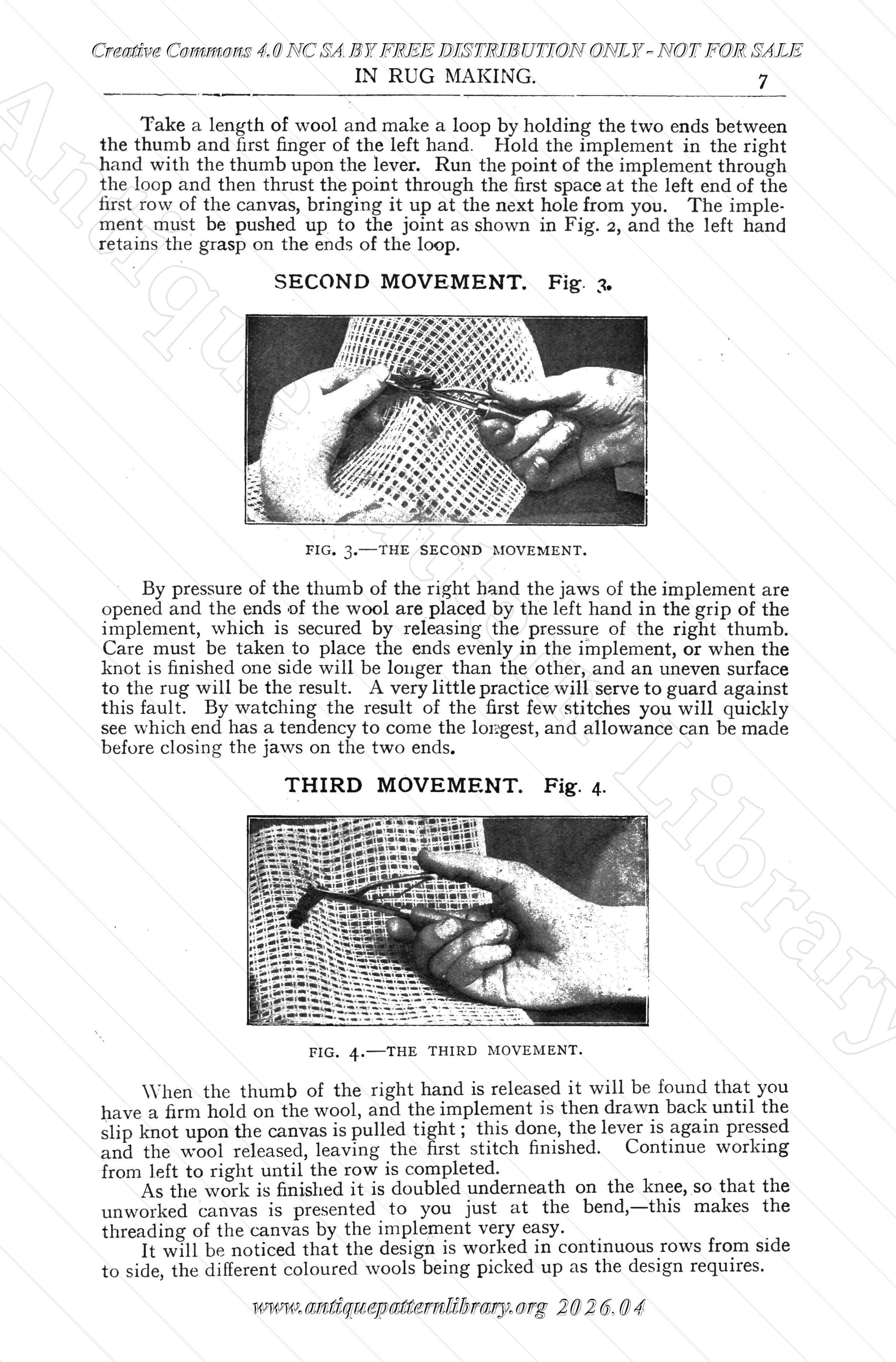 No. 7 in a series of "First Lessons", The Practical Needlework Teacher. Explanations and photos of rug making materials and requisites: canvas, wool, patent rug machine, gauge, lining. Designs: Osmanic, Tauris, Shiraz and Wiltona (all Penelope Rug Designs) and Bokhara. Preparations for Work, Cutting the Wool, Position for Work, and then illustrations of the various design executions as well as colors and sizes.