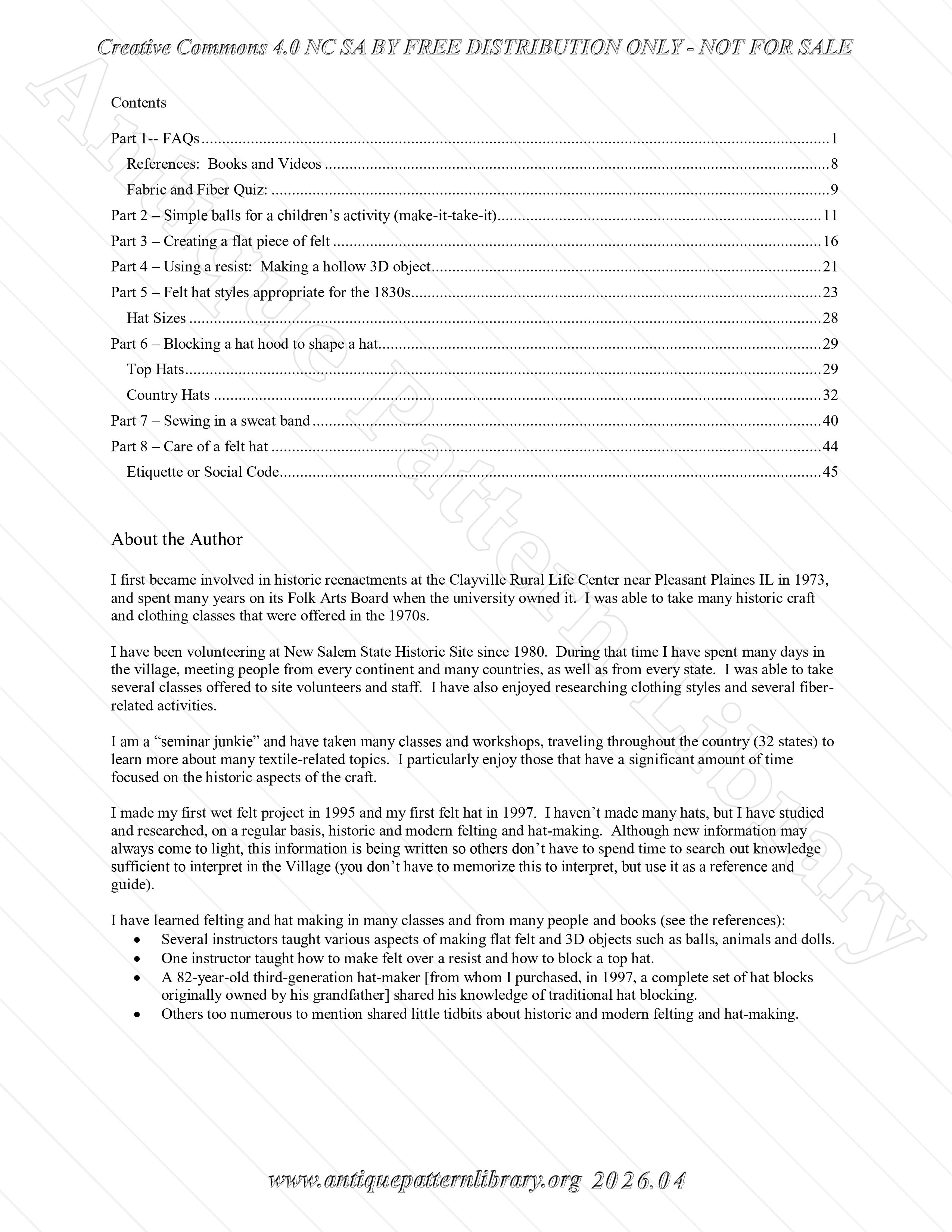 Making felt from wool, small balls, flat piece, hollow objects and then felt hats. Styles, sizes, shaping hats, sewing in sweat band, care of a felt hat. Additionally a note on the 1830s code of hat wearing. Richly illustrated.