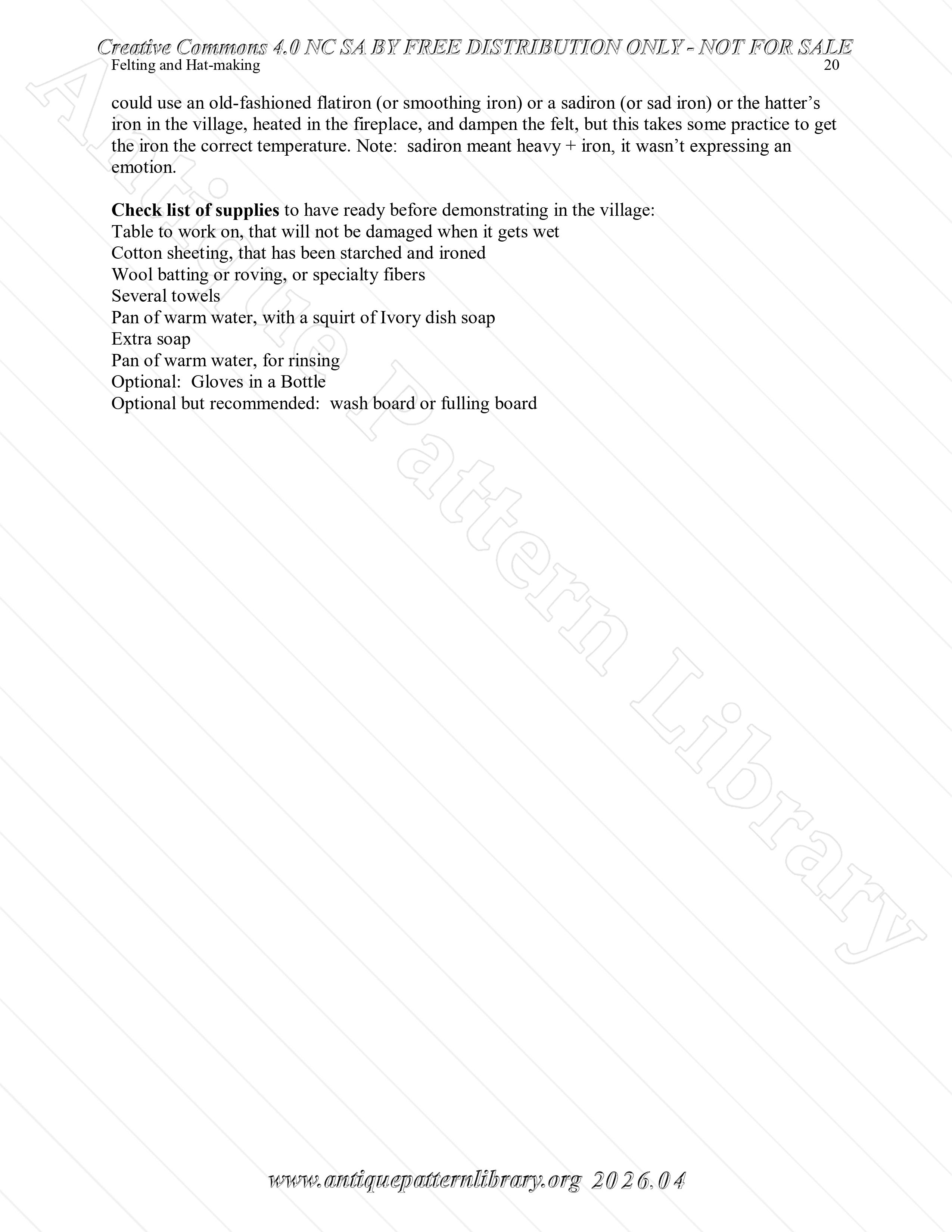 Making felt from wool, small balls, flat piece, hollow objects and then felt hats. Styles, sizes, shaping hats, sewing in sweat band, care of a felt hat. Additionally a note on the 1830s code of hat wearing. Richly illustrated.