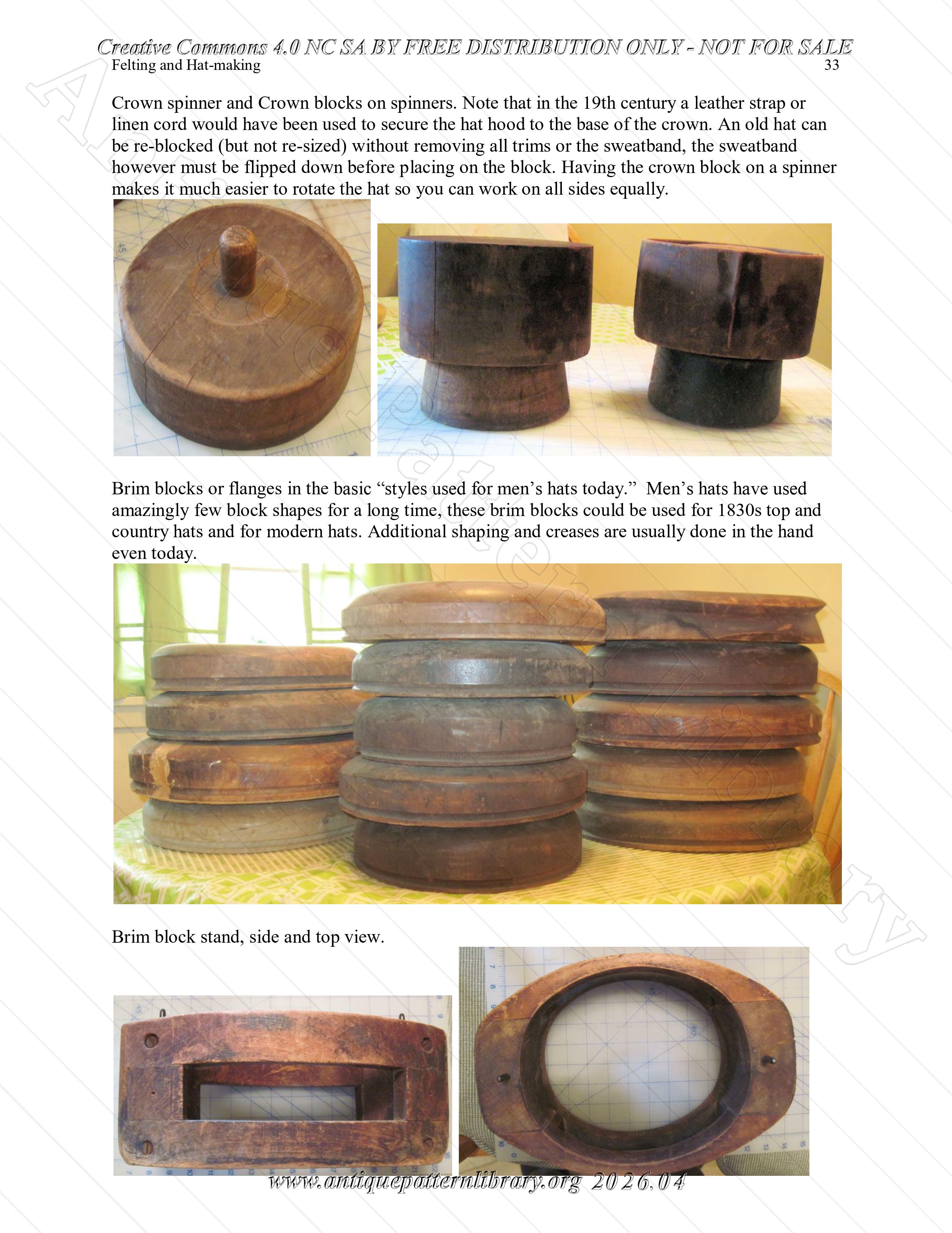 Making felt from wool, small balls, flat piece, hollow objects and then felt hats. Styles, sizes, shaping hats, sewing in sweat band, care of a felt hat. Additionally a note on the 1830s code of hat wearing. Richly illustrated.