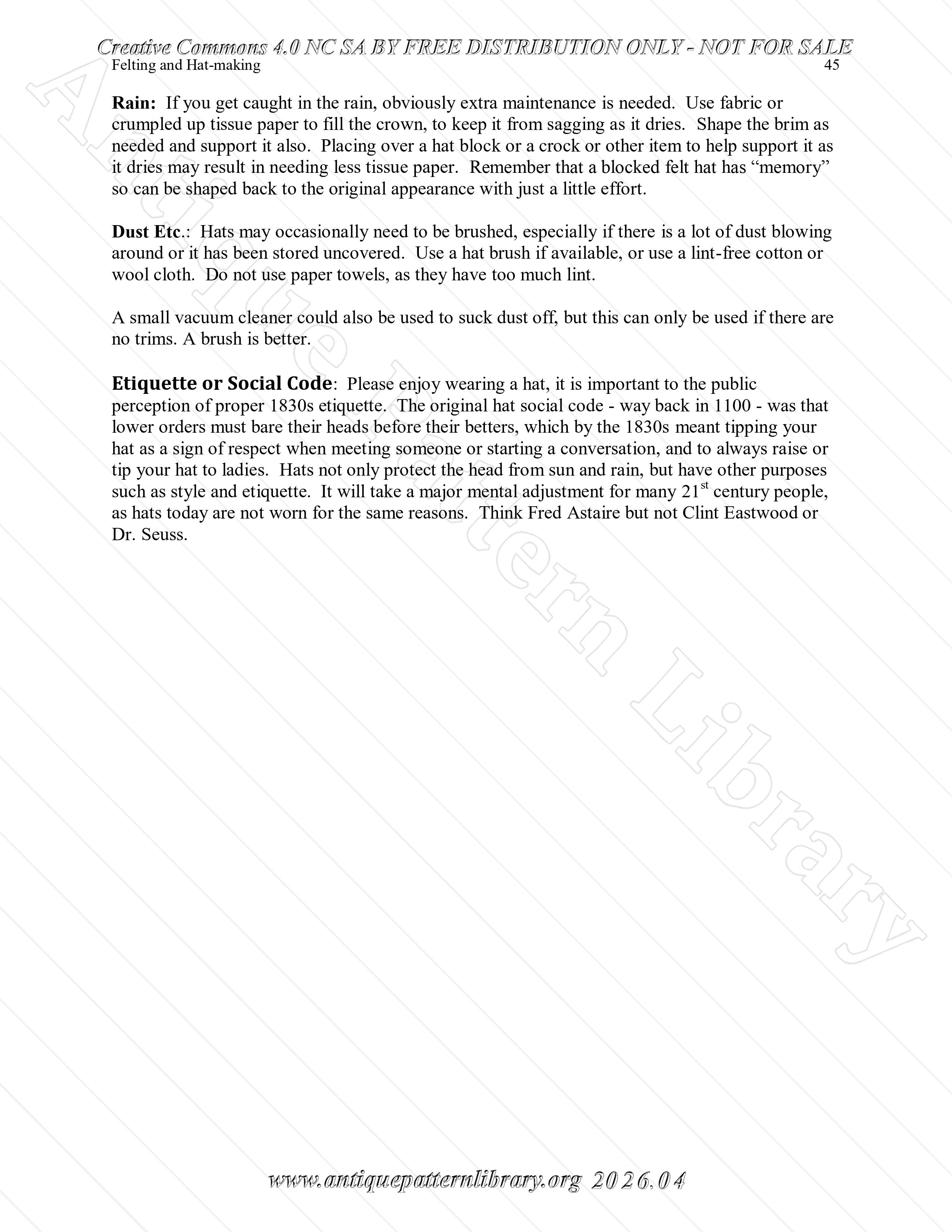 Making felt from wool, small balls, flat piece, hollow objects and then felt hats. Styles, sizes, shaping hats, sewing in sweat band, care of a felt hat. Additionally a note on the 1830s code of hat wearing. Richly illustrated.