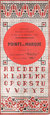 Small leporello, 10 pages in brown on one side and blue on the reverse side. In brown, border and corner designs as well as separate motifs in flat stitch and backstitch. In blue, alphabets, some repeating patterns and small motifs that were used in other albums of the same publisher. This booklet has not been charted.